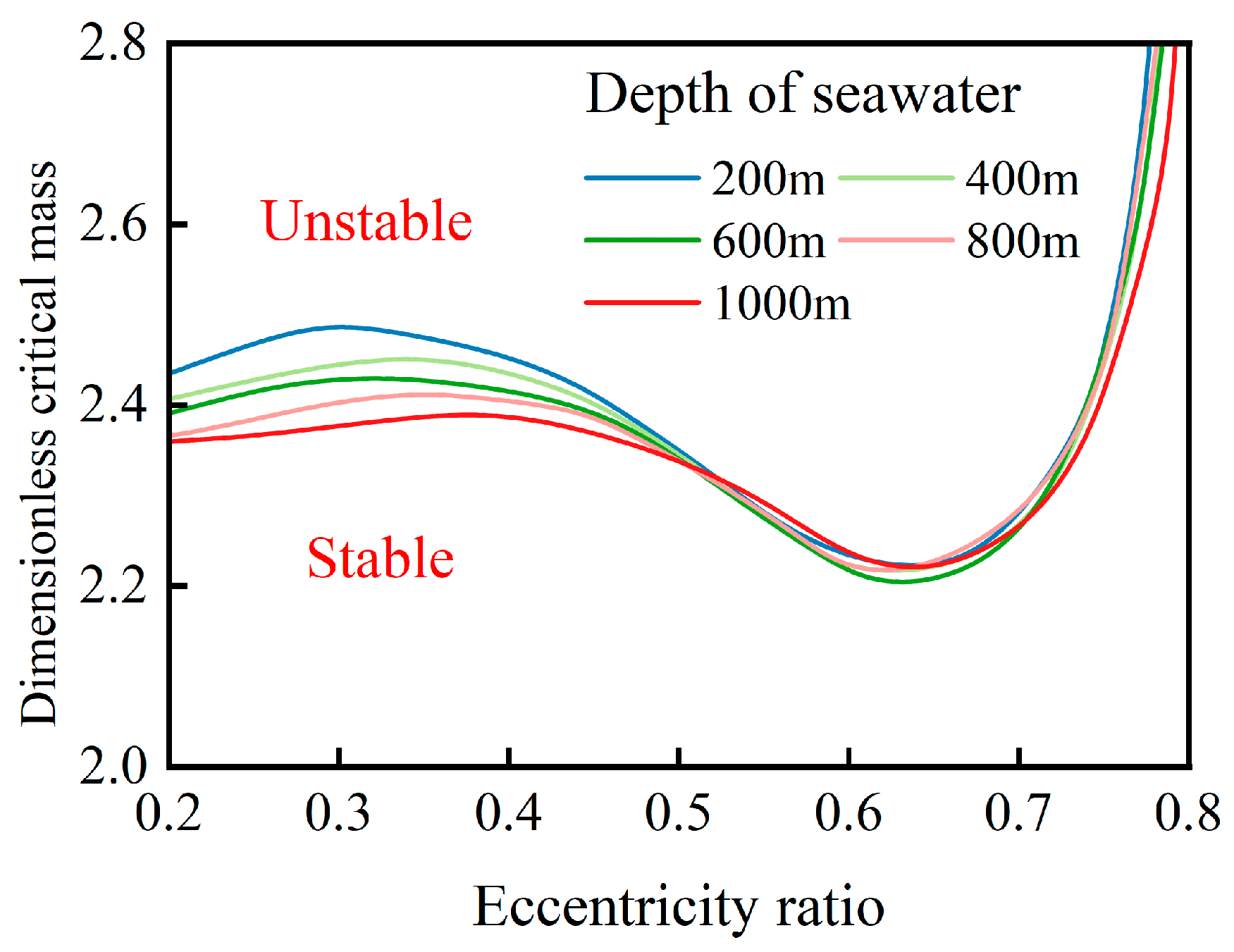 - Increasing seawater depth reduces the critical mass of water-lubricated rubber bearings at low eccentricity ratios, thereby degrading bearing stability.