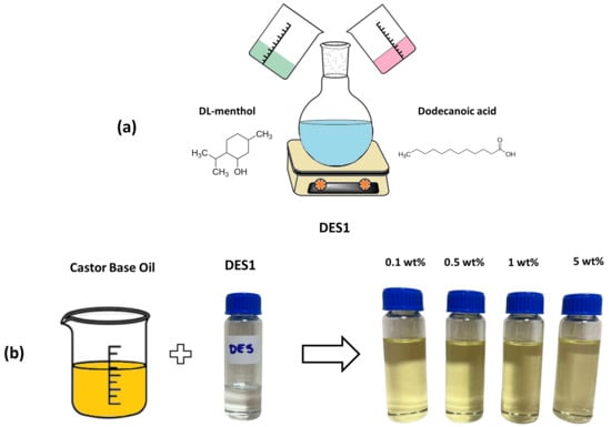Procedure of DES1 synthesis (a) and DES1 lubricant formulation mixing castor oil and synthesized DES (b).