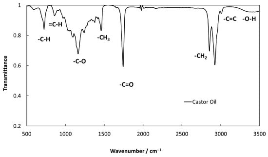 Thus, Figure 2 exposes the castor oil IR spectrum with adsorption peaks at 3500 cm–1 that correspond to the -O-H stretching vibration. A minor stretching vibration peak at 3015 cm–1 is associated with the double -C=C bond. Also, deformation vibrations of -CH3 happen at about 1460 cm–1 and 1370 cm–1. Likewise, two intense peaks at 2935 cm–1 and 2845 cm–1 are linked to the stretching vibrations (symmetric and asymmetric) of CH2, correspondingly. Additionally, an intense and thin band at 1745 cm–1 is connected to the double -C=O bond of esters. Moreover, the bands at 1245 cm–1 and 1165 cm–1 are correlated with the stretching vibration for the -C-O of the ester group. In addition, a little peak at 850 cm–1 is assigned to the bending vibration of =C-H and the strong band at 720 cm–1 is typical of -CH for deformation vibration [,].