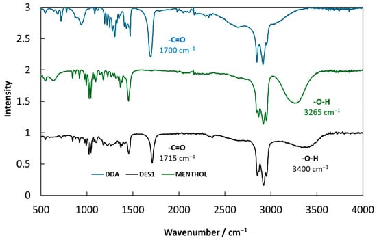 Concerning the FTIR spectrum of DES1 and their individual components, Figure 3 displays the following characteristic peaks: the peaks observed at 1390, 1270, 920, and 710 cm−1 are ascribed to the stretching/bending vibrations of the O-H, C-H, C=O, and C-O groups of dodecanoic acid, repectively []. Concerning the typical DL-menthol peaks, the spectrum show peaks around 1365 cm−1 (methyl groups), 990–1230 cm−1 (C-O stretching vibration), 1020–1050 cm−1 (C-O stretching vibrations), 850–980 cm−1 (hexagonal ring), and at 495–670 cm−1 (skeletal mode vibration) []. Moreover, the distinctive peak of dodecanoic acid at 1700 cm−1 corresponds to the carbonyl (C=O) stretching vibration, in this DES1 spectrum this is shifted to 1715 cm−1 []. Furthermore, the typical OH- group of DL-menthol at 3265 cm−1 is shifted to 3400 cm−1 in the DES1 spectrum []. These alterations denote hydrogen bonding connections among DL-menthol and dodecanoic acid, proving the effective synthesis of DES1.