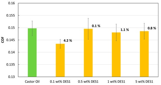 The average friction coefficients that were empirically attained for the castor oil base and the additivated DES1 lubricants are exposed in Figure 4 and Table 1. As can be observed, for all the DES1 lubricants the obtained friction coefficientes are slightly enhanced compared to the castor oil base. Specifically, the best antifriction performance was detected for the castor oil + 0.1 wt% DES1 lubricant with an average friction coefficient of 0.1434, while the one of the castor oil base is 0.1497, which involves a friction reduction of 4.2%. Consequently, the incorporation of a deep eutectic solvent (DES1) as an additive to the castor oil base yields an antifriction capability that ensures superior tribological performance in comparison to the base oil devoid of additives. The aforementioned phenomenon can be attributed to the polar functionalities of DES1, which facilitate lubrication and the interactions with steel contact interfaces, thereby enhancing the tribological performance of castor oil [].