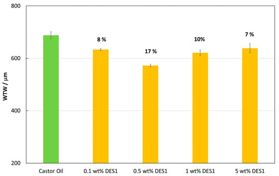Wear track widths (WTWs) of steel surfaces lubricated with castor oil and DES lubricants.