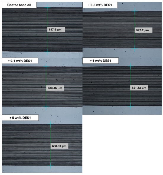 The tribological performance enhancements can clearly be seen in the microscopy images of the worn tracks exhibited in Figure 7. It is clear that the wear track width considerably decreases for castor oil after mixing with DES additive. Also, blending DES with the castor oil base results in inferior interfacial roughness, a narrower wear width, and a shallower wear track. Consequently, in the context of castor oil lubrication, the presence of deep grooves in the friction direction is indicative of abrasive wear, as evidenced by the formation of deep furrows. Nevertheless, when DES are added to the castor oil base, specially the 0.5 wt% DES1 lubricant, the friction surfaces are notably smoother, with reduced furrows, which are narrower and shallower than those for the castor oil base. Therefore, it can be suggested that the DES1 additives form a protective tribofilm that cover the steel surfaces and result in improved antiwear performance. Therefore, the attraction of DESs toward engineering surfaces and their layered structure play significant role in the tribological properties [], generating DES1, which is a suitable layering structure for tribo interfaces, faciliting sliding actions and decreasing friction and wear. The arrangement of DES1 layers over steel surfaces is influeced by the charge distribution in the salt (HBA), the interaction with hydrogen, the chemical composition of HBA and HBD, and the charge on the engineered surfaces. A similar behavior was also observed by Li et al. [] who studied the same DES1 as additive for PAO40 and PEG200 oils. The favorable tribological performance was ascribed to the tribo-chemisorption of DES with steel surfaces. Furthermore, the synthesis of oil-soluble DESs from materials such as menthol and thymol has been identified as a novel approach to developing high-performance lubricant additives. These DESs have been demonstrated to effectively modify existing lubrication systems, providing enhanced friction characteristics and enabling the formation of tribofilms that significantly mitigate wear [].