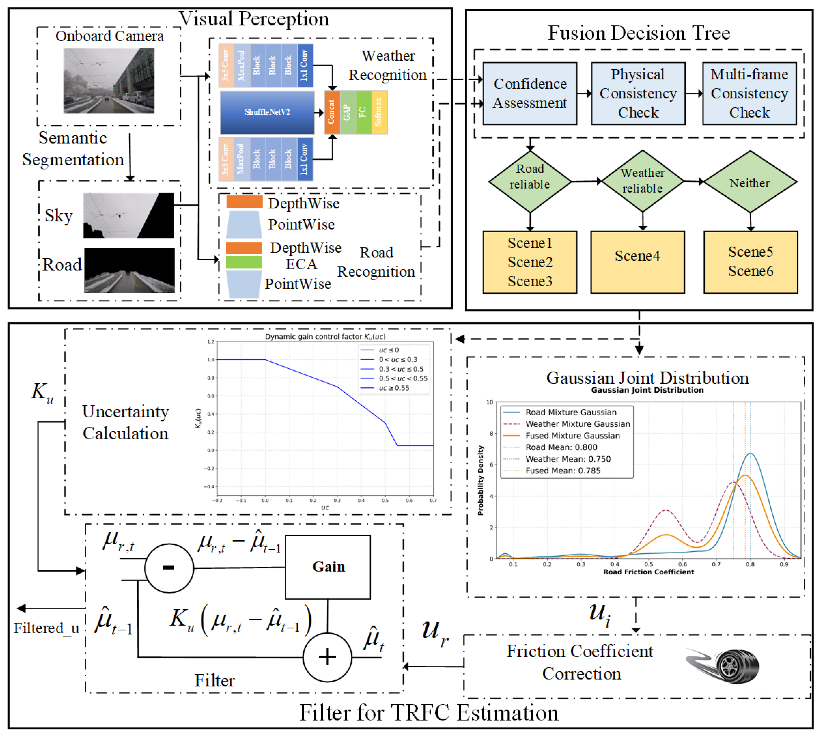 21]. Guo et al. proposed a vision-vehicle dynamics fusion framework for estimating peak TRFC. A lightweight CNN identifies road type to determine a friction coefficient range, while a UKF estimates the friction coefficient based on vehicle dynamic states. After spatiotemporal synchronization, a confidence-based fusion strategy refines the final result [