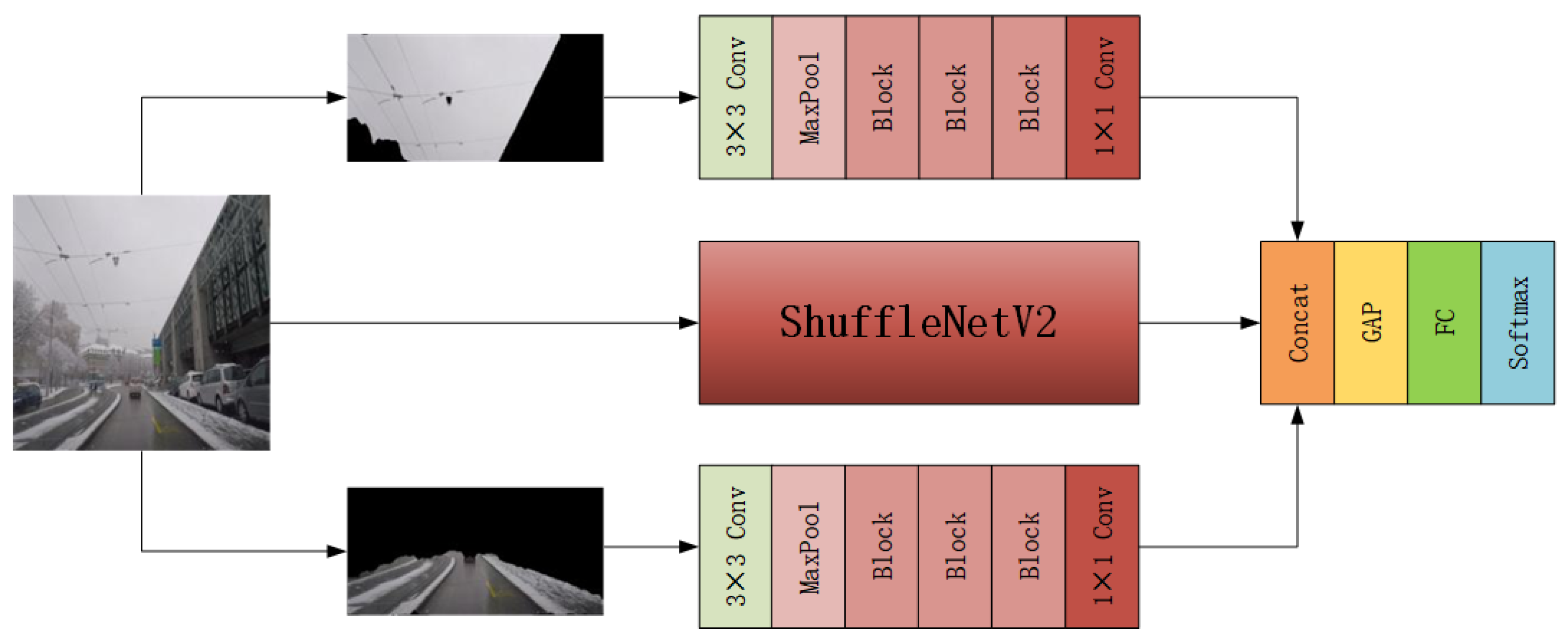 We develop a lightweight three-branch convolutional neural network that simultaneously captures sky, road, and global image features for effective weather recognition.