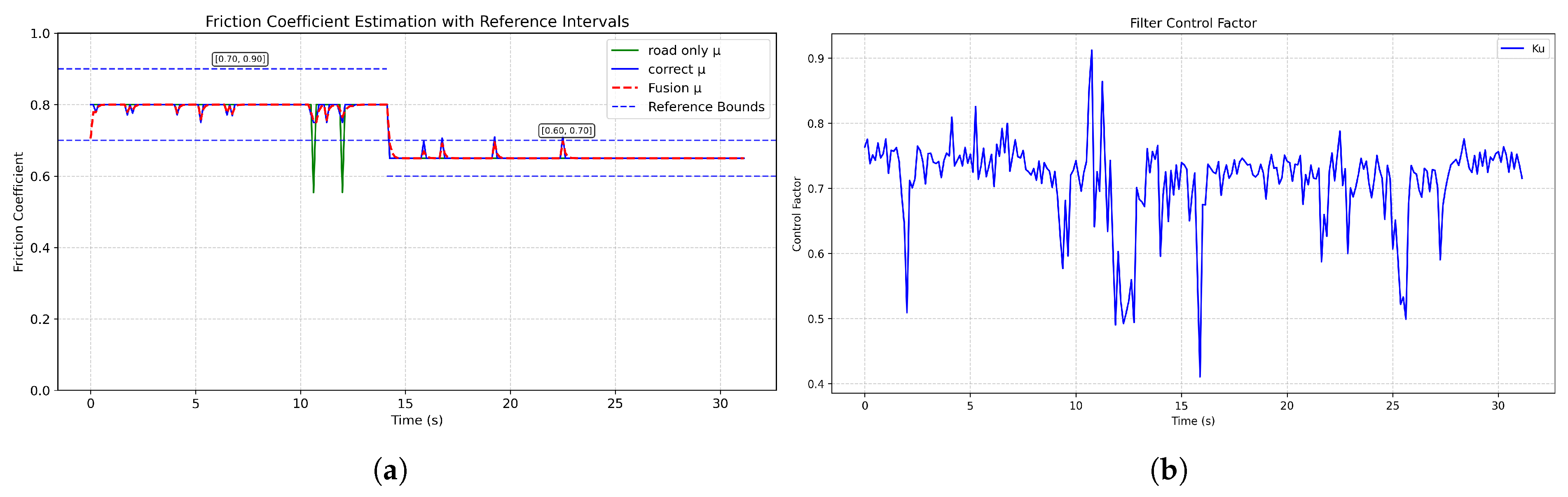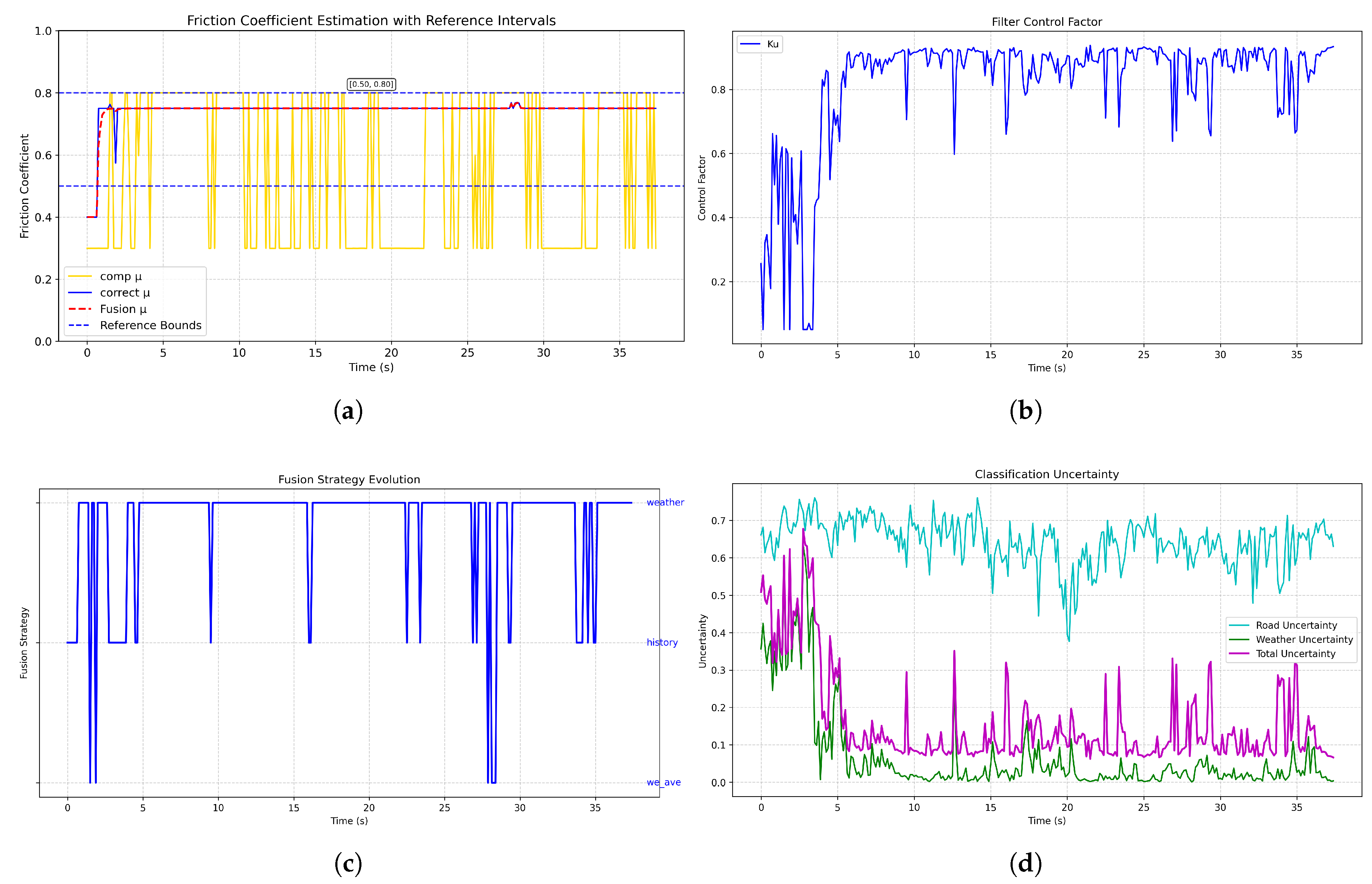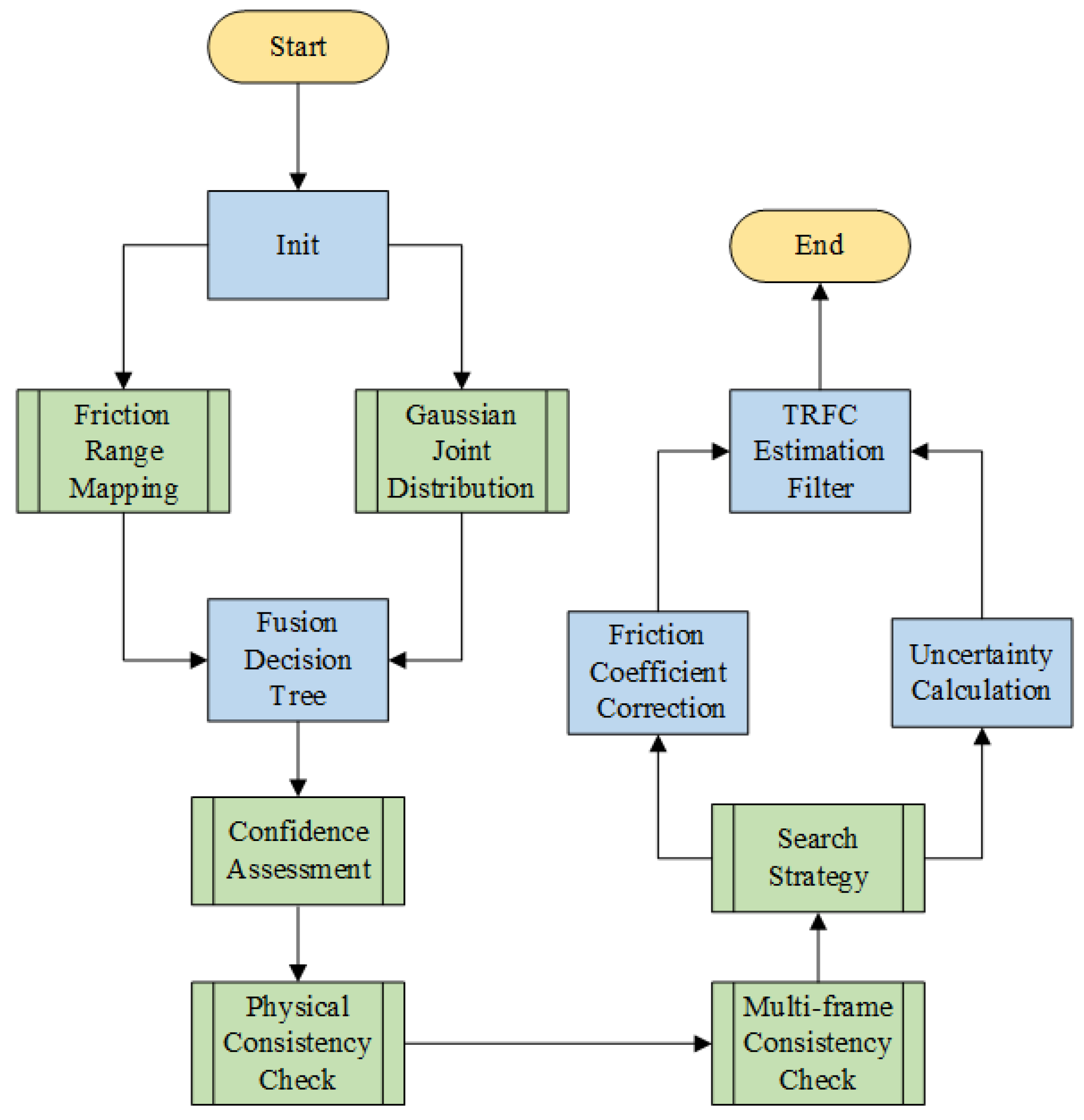 13]. Zhao et al. introduced an adaptive TRFC estimation framework that fuses visual and vehicle dynamic information. Multi-temporal image fusion technology was employed to enhance road condition recognition, combined with a residual adaptive unscented Kalman filter (UKF) to improve estimation accuracy and robustness [