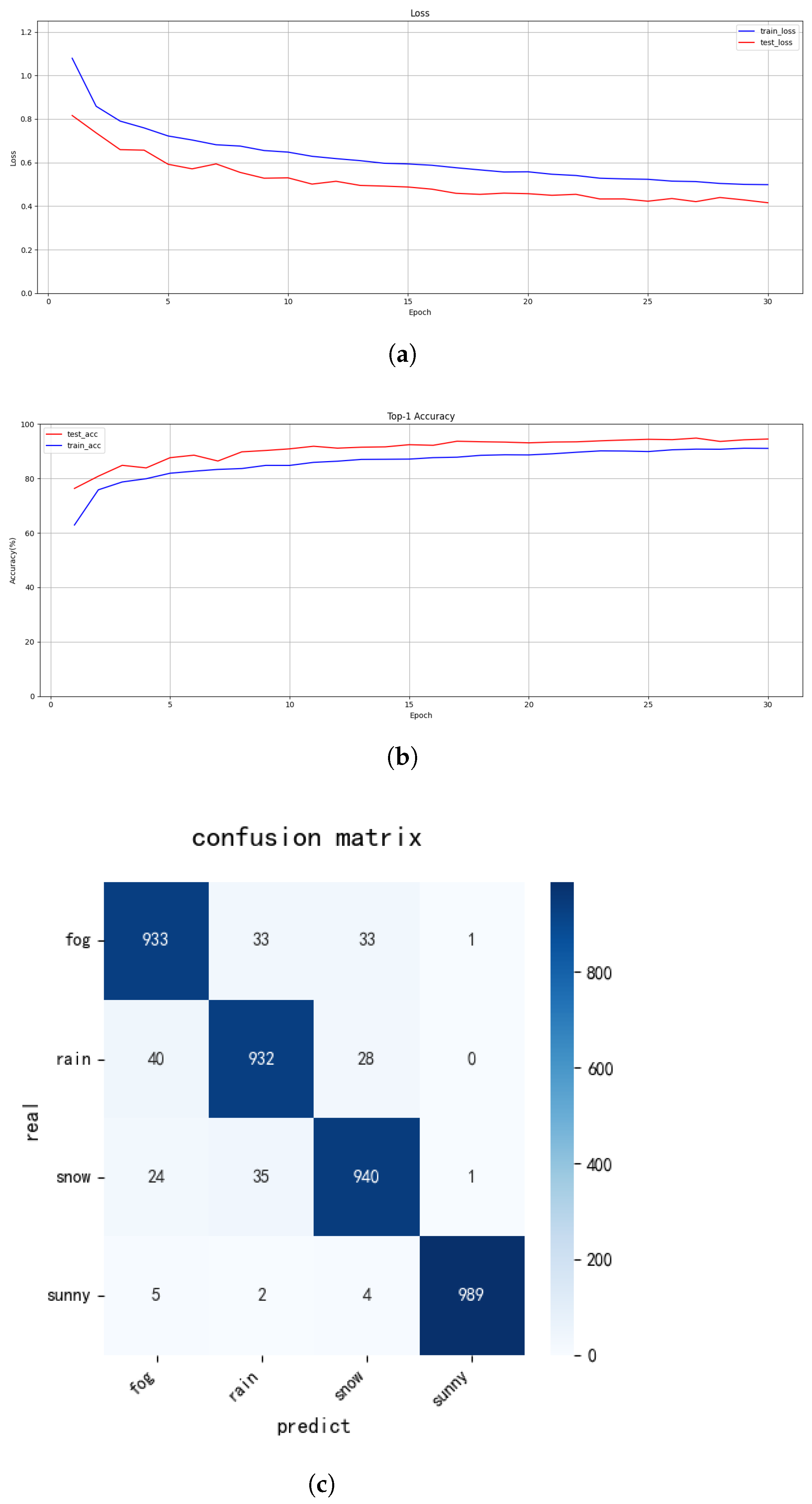 16]. However, these methods rely solely on CNN features for weather classification, neglecting weather-sensitive cues such as illumination changes and contrast variations, which limits their accuracy. Li et al. proposed a multi-feature weighted fusion method that extracts handcrafted weather-related features (e.g., haze, contrast, brightness) and fuses them with CNN features into a high-dimensional vector for weather image classification. This approach improved weather recognition accuracy compared to using CNN features alone [