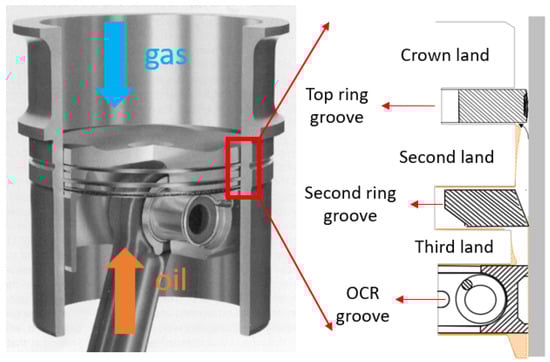 In a typical internal combustion (IC) engine, the piston ring pack consists of a piston and three piston rings: the top ring, the second ring, and the oil control ring (OCR). A schematic of the piston ring pack assembly and some common terminologies are shown in Figure 1. During engine operation, lubrication oil is supplied to the bottom of the piston. The function of the oil control ring is to limit the amount of oil that can be leaked to the upper region to prevent excessive oil consumption and facilitate the oil release from the ring pack to the crankcase. On the other hand, gas flow comes from the combustion chamber, and the role of the top ring is to seal the combustion chamber from the lower region of the piston ring pack to prevent power loss. For a long time, lubrication oil consumption (LOC) has been recognized as a significant contributor to overall engine emissions. Therefore, it is of practical interest to measure the LOC value of a certain piston ring pack design during the development process. Typical LOC measurement methods include drain and weight [1], measuring the CO2 concentration in the exhaust gas while using hydrogen as fuel [2], and tracer methods [3]. In particular, the tracer methods are more widely used due to better accuracy. However, countermeasures to LOC are challenging to obtain because the relevant physical mechanisms are not fully understood. Oil consumption can be defined as excess oil entering the combustion chamber and can be largely attributed to the oil transport process in the piston ring pack, along with additional contributions from oil vaporization and other mechanisms [4]. Further research in [5,6,7] highlighted the intricate relationship between oil transport and oil consumption, and the complexity of all the physical mechanisms in the oil transport process was emphasized. Therefore, resolving the various physical mechanisms relevant to the oil transport process in the piston ring pack is crucial for developing a better understanding of oil consumption and for predicting it through modeling for arbitrary engine profiles.
