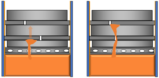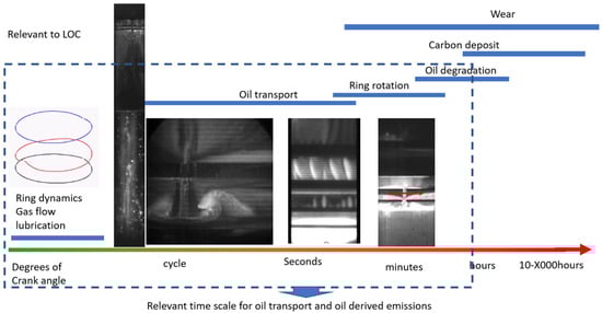 For oil to contribute to oil consumption, it must be transported from the lower region of the piston ring pack to the upper region. The oil transport process involves complex interactions between liquid oil and the gas flow in the piston ring pack, the piston ring dynamics, as well as the piston rings’ structural response to bore distortion and the changing pressure environment. A considerable amount of effort has been devoted to studying oil transport and oil consumption. On the experimental side, 2D laser-induced fluorescence (2DLIF) techniques were used to visualize the oil transport during engine operation. The works in [6] identified inertia force, piston ring scraping and pumping, as well as the shear stress from gas flow, are the major driving factors of oil transport. An improved 2DLIF system used in [8] showed that the oil control ring gap is the main oil source to the upper region of the piston ring pack. Additionally, the top ring gap is found to be a direct path for oil leakage under closed throttle conditions, resulting in high oil consumption. Both [8] and [9] observed and studied the oil entrainment to the liner by the vortex formed downstream the top ring gap. The relationship between bore distortion and oil consumption was also studied [10,11,12]. It was found that as the higher-order bore distortion increases (e.g., the bore is more distorted), there tends to be an increase in oil consumption due to the ring not being able to conform well to the bore.