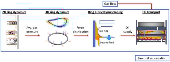 Recognizing the important roles of ring dynamics and gas flow in oil transport (and hence oil consumption), as well as the need for efficient computation, this work uses the modeling methodology shown in Figure 4. In particular, the 2D ring dynamics model [13] is run to obtain the average gas pressure in each region of the piston ring pack. Using the outputs from the 2D model, a 3D ring dynamics model further calculates the force distribution and the ring dynamics at each point along a piston ring. With the ring–liner contact force known, a ring–liner lubrication model simulates the local scraping rates (up-scraping and down-scraping) of the top two rings. The oil down-scraped by the rings is the oil supply to the piston lands. An oil transport model is then used to simulate the oil transport pattern in the piston ring pack. Since oil transport is mainly driven by gas flow, a physics-based and data-driven hybrid gas flow model is developed to resolve the flow pattern. A separate liner vaporization model is also developed to account for its contribution to the overall oil consumption.