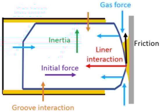 The terms M and K are the mass and stiffness matrix, and their derivations can be found in [14,21,23]. The term u is a displacement vector that contains the axial displacement, radial displacement, and the twisting motion at each of the structural grid points. The forces considered for a cross-section of the ring are shown in Figure 5. These include: forces due to ring–liner interaction (asperity contact and hydrodynamic), forces due to ring–groove interaction (asperity contact and hydrodynamic), inertia force, gas force, and initial force (, force required to close the ring from the free shape to the circular bore). Forces except for the initial force are included in the term . Note that the gas pressure for computing the gas force is computed with the 2D ring dynamics model [13]—the decoupling of 3D ring dynamics computation from gas pressure computation is the key for achieving better computational efficiency.
