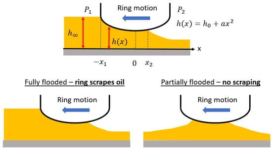 Due to the large difference between the ring axial width and the engine stroke, the unsteady term of the Reynolds equation is only important for a few degrees around the TDC and BDC. Thus, to maintain oil mass conservation, neglecting the unsteady term is a good approximation. The domain of interest is shown in Figure 7, where and are the length of the leading edge and the trailing edge of the ring’s wetting area, respectively. is the pressure at the leading edge and the pressure at the trailing edge. is the incoming oil film thickness. a is the quadratic coefficient of the parabolic surface profile of the ring. The speed at which the ring moves is U. With the Reynolds exit condition applied at the trailing edge, and a mass balance between the inlet and the outlet, the following expressions can be derived: