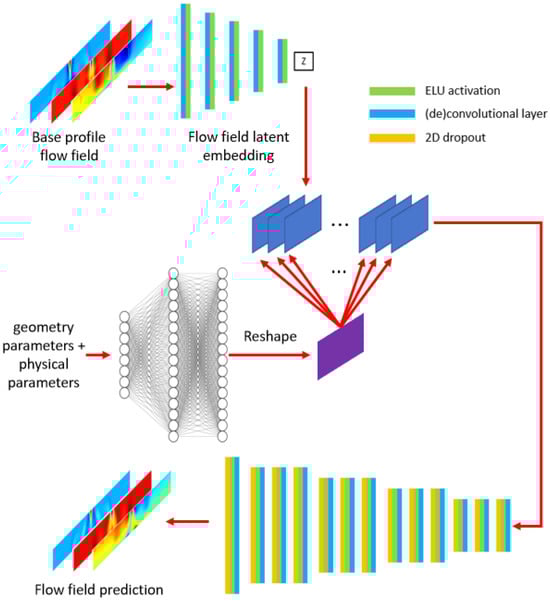 To predict the flow field, an encoder network is first used to generate a latent representation of the base profile flow field. Simultaneously, the output of a fully connected network, which takes the geometrical and physical parameters as inputs, is reshaped and then multiplied element-wise with each channel of the latent representation of the base flow field. The resulting product then goes through a decoder network to generate the actual flow field.