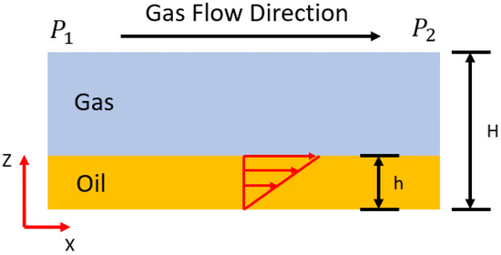 For the gas-driven oil transport, the derivation follows from the methodologies in [6,28] using a Couette–Poiseuille flow model. An illustration of the model is shown in Figure 12. Along the circumferential direction, the Navier-Stokes equation can be simplified to