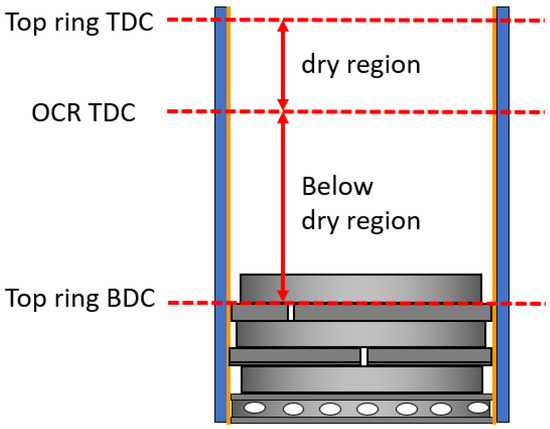 Below the dry region, oil is always refreshed by the oil control ring due to ring rotation and the extra oil leakage from the oil control ring. Therefore, the oil vaporization behavior is identical every cycle. The average oil vaporization rate within one engine cycle can be determined by counting the evaporated mass for each species from the portion of the liner exposed to the combustion chamber. On the other hand, there is no oil supply from the oil control ring in the dry region. The only oil supply to the liner is from vortex-enhanced bridging, and it is assumed that the supplied oil fully floods the top ring. Hence, the oil film thickness remaining after the top ring passes can be determined accordingly using the ring–liner lubrication model, and the vaporization rate in the vortex region can be calculated using the expressions developed above. It is important to note that due to top ring rotation, an area on the liner outside the vortex region may still have oil left if it was previously inside the vortex region. Oil continues to evaporate in this area until it becomes dry. This is illustrated in Figure 14. The total vaporization rate in the dry region is found by simply summing the vaporization rate at each circumferential location.