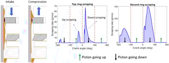 Figure 16 shows the scraping behaviors of the top two rings under one particular ring gap arrangement. It is assumed that the size of the oil control ring gap is 0.5 mm and that it leaves an oil streak of 5 μm thick onto the liner. During the intake stroke, when the piston moves down, the second ring is the first barrier to down-scrape the extra oil leakage from the oil control ring. Some oil passes the second ring, which is then down-scraped by the top ring. Some oil can still pass the top ring, and the implication of this is that during the subsequent compression stroke, when the piston moves back up, due to the increased gas pressure which pushes the top ring more towards the liner, the top ring can up-scrape the oil. Then, during the expansion stroke, high gas pressure leads to good ring–liner conformability, and both the top ring and the second ring can down-scrape the excess oil supply from the oil control ring gap.