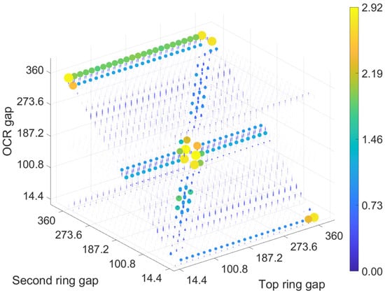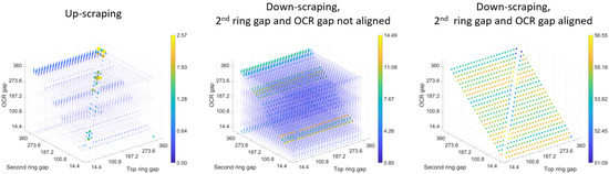 The top ring scraping behavior is of particular interest since down-scraping determines the amount of oil supply to the second land, and up-scraping directly contributes to LOC. Figure 17 shows the top ring up-scraping and down-scraping rates under all possible ring gap arrangements. In particular, each dot represents the scraping rate corresponding to one set of ring gap arrangement, and the larger the dot is, the higher the scraping rate. Color is also added to aid in result visualization. The ring’s scraping behavior can be influenced by the arrangement of the ring gaps. This is because when the ring is placed in a distorted bore, the local ring–liner conformability can differ for a particular circumferential location along the bore, depending on the gap location. Another important observation is that when the oil control ring gap aligns with the second ring gap, the top ring down-scraping rate is the highest, since all the oil supply from the oil control ring gap is scraped by the top ring in this case. Finally, when the three ring gaps are close to each other, the up-scraping rate is higher, indicating a higher contribution to the overall LOC from top ring up-scraping.