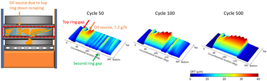 In general, the scraping behavior of the top two rings is dependent on the relative arrangements between the top ring gap, the second ring gap, and the oil control ring gap, as illustrated in Figure 15. The oil supply is from the oil control ring gap, and for a particular location of the oil control ring gap, if the arrangements of the top ring gap and the second ring gap are different, the scraping rate of each of the top two rings are likely to be different due to the difference in the local ring–liner conformability at the oil control ring gap location. If the circumferential locations of all three gaps are close to each other, oil can leak to the upper region more easily, which may result in a higher up-scraping and/or down-scraping rate for the top ring.