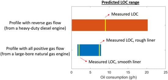 It is important to validate the simulation results by comparing them against experimental measurements. This can help determine whether the model can be applied with confidence. Figure 27 shows the predicted LOC range for the two engine profiles studied in this work, along with the experimentally-measured LOC value provided by industrial sponsors (measured with drain and weigh). It can be seen that the real LOC value falls well within the predicted range.