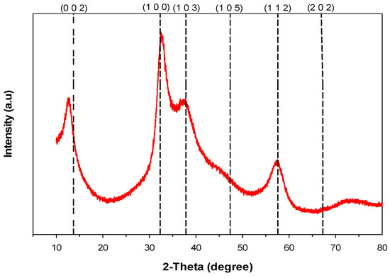 XRD was used to characterize the crystalline structure of the deposited coating, and the corresponding diffraction pattern is shown in Figure 1. The diffraction peaks observed at 32.15°, 37.83°, 47.45°, 57.81°, and 67.26° are well corresponding to the crystal planes of (1 0 0), (1 0 3), (1 0 5), (1 1 2), and (2 0 2), respectively, which are consistent with the hexagonal MoSe2 crystal structure (ICDD card No. 00-077-1715). The diffraction peak associated with the (0 0 2) plane shifts slightly to a lower diffraction angle, from 13.69° to 12.65°. This shift indicates a lattice elongation caused by defects such as vacancies, impurities, and dislocations, as reported by Dunn et al. [49]. The broad peak at approximately 37.83° is highly asymmetric with a long tail toward higher angles, which is a typical feature of sputtered TMD coatings [5,50,51,52,53,54,55]. According to Weise et al. [56], this broad and asymmetric peak corresponds to a turbostratic stacking of (10 L) planes (where L = 0, 1, 2, 3,…), indicating that the deposited coating has a mixed-phase structure. This structure contains both amorphous regions and disordered crystalline (semi-crystalline) MoSe2 nanocrystals.