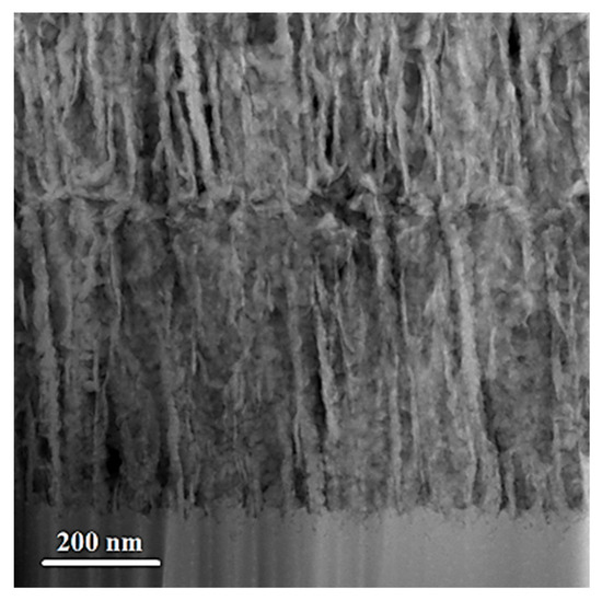 Cross-sectional TEM image reveals the porous and columnar structure of MoSe2 coating.