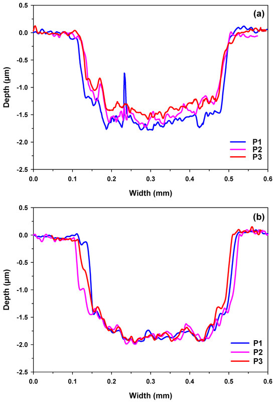 Cross-sectional wear track profiles of MoSe2 coatings tested in: (a) PAO4-lubricated sliding and (b) dry sliding. P1 is measured at the center of the wear track, whereas P2 and P3 are measured at its edges.