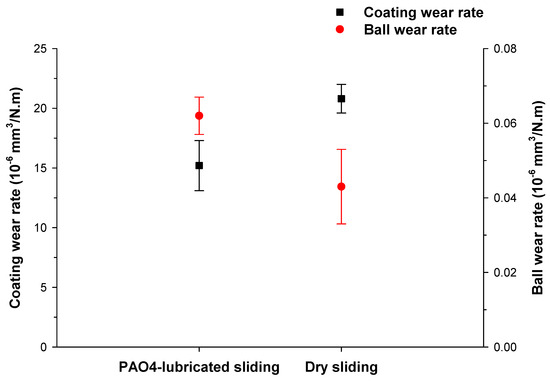 - Despite the higher coefficient of friction, the coating exhibited enhanced wear resistance in PAO4-lubricated sliding, with a wear rate 27% lower than that observed in dry sliding. This improvement in the wear resistance of the coating was due to the presence of PAO4 at the sliding interface, which acted as a sealant and protected the coating from the formation of abrasive metal oxides.
