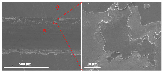 SEM image of the wear track of MoSe2 coating tested in PAO4-lubricated sliding. The image on the right shows a close-up view of the top edge of the wear track.