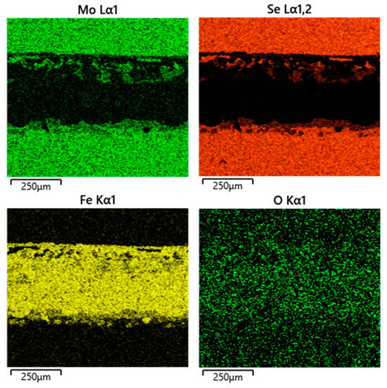 EDS mapping of the wear track of MoSe2 coating tested in PAO4-lubricated sliding.