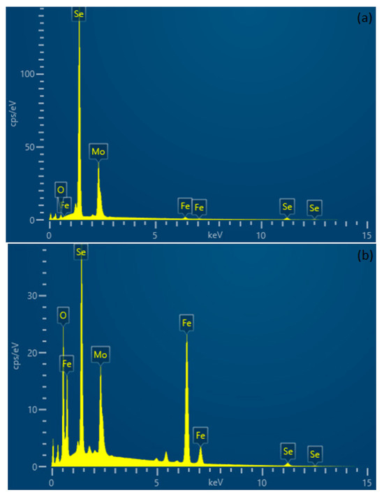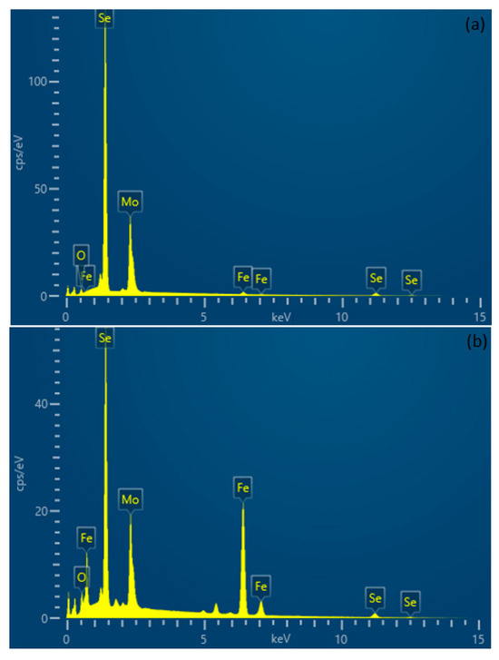 EDS point analysis of: (a) the as-deposited MoSe2 coating (point A) and (b) the center of the wear track of the coating tested in PAO4-lubricated sliding (point B).