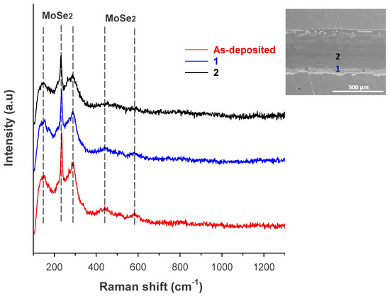 Raman spectroscopy, with its superficial detection depth and greater surface sensitivity compared to EDS, was used to investigate potential microstructural changes in the coating wear tracks and their sliding counterparts. The Raman spectrum of the as-deposited coating (reference) showed five peaks corresponding to MoSe2 at wavenumbers 155 cm−1, 235 cm−1, 290 cm−1, 443 cm−1, and 596 cm−1 [54,62], see Figure 9. The Raman spectra acquired from different positions on the wear track showed that it was still largely covered with MoSe2 despite the severity of wear. These spectra appeared similar to that of the as-deposited coating, indicating that no tribo-induced structural changes in the crystallinity of MoSe2 occurred within the wear track. This is consistent with other findings where Raman spectroscopy did not detect structural changes in TMD coatings within wear tracks [29,32,63].