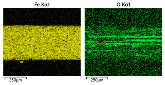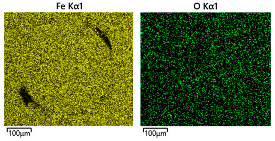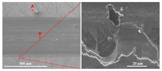 As shown in Figure 14, the wear track was 455 µm in width, exceeding the width of the PAO4-lubricated test. Similarly to the lubricated test, the dry sliding wear track also exhibited surface delamination and chipping around its edges. EDS mapping revealed a high concentration of iron within the wear track, and depletion of molybdenum and selenium compared to the untested coating surface, see Figure 15. It is important to emphasize again that EDS is not a surface-sensitive technique and instead collects signals from a depth of a few microns into a tested sample. Therefore, the observed dominant presence of iron originates from the steel substrate beneath the remaining coating, indicating significant wear and depletion of the MoSe2 layer during dry sliding. The presence of oxygen was also detected within the wear track, particularly in scratches parallel to the sliding direction. EDS point analysis performed at the center of the wear track (point B), which was the area with the most severe damage, showed a significant increase in the intensity of the peak belonging to oxygen compared to that of the as-deposited coating (point A), see Figure 16. This was likely to be the reaction of the substrate with oxygen in the surrounding atmosphere, forming iron oxides.