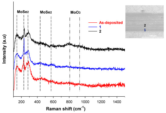 Figure 13 shows the Raman spectra acquired from different positions on the ball wear scar. These spectra differed significantly from those acquired from the wear track shown in Figure 9. The Raman spectrum acquired from the center of the wear scar (position 3) revealed very broad and not easily identifiable MoSe2 peaks, suggesting that only a small amount of the coating material adhered to the center of the wear scar. Clear peaks of MoSe2 with smaller intensities than those of the as-deposited coating were only observed at positions 1 and 2 on the wear scar. The Raman spectra acquired from the center and edge of the wear scar (positions 3 and 1) showed two broad peaks at wavenumbers 815 cm−1 and 940 cm−1, attributable to MoO3 [64,65]. In comparison to the intensities of MoSe2 peaks in the as-deposited coating, the lower intensities of MoSe2 peaks in the wear scar at all the analyzed positions clearly indicated that only a small amount of the coating material transferred and adhered to the ball during sliding, further supporting and confirming the results obtained from EDS.