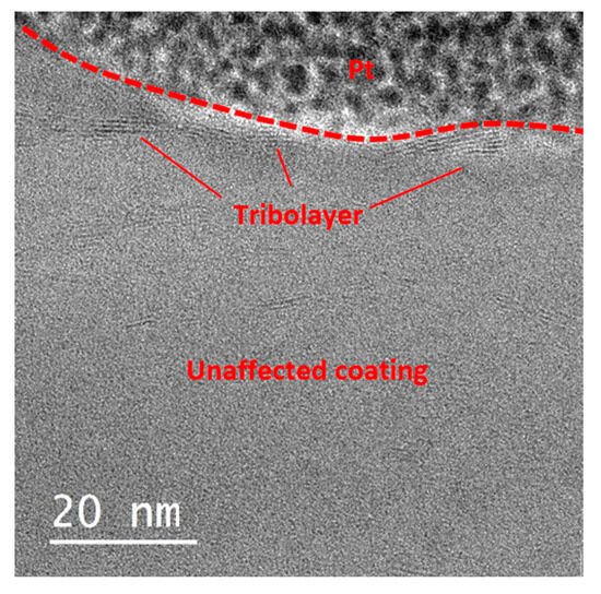 A thin lamella was extracted from the wear track for TEM analysis, see Figure 10. The image did not reveal any change in the crystallinity of MoSe2 within the wear track, and consequently, a well-ordered crystalline MoSe2 tribolayer did not form. The MoSe2 basal planes in the topmost surface of the wear track were either perpendicular or randomly oriented relative to the sliding direction, preventing them from acting as easy slip planes, which are essential for minimizing friction in TMD coatings. This TEM result confirmed the observation of Raman spectroscopy and indicated that PAO4 hindered the formation of a crystalline MoSe2 tribolayer.