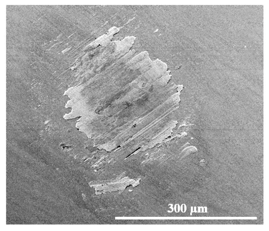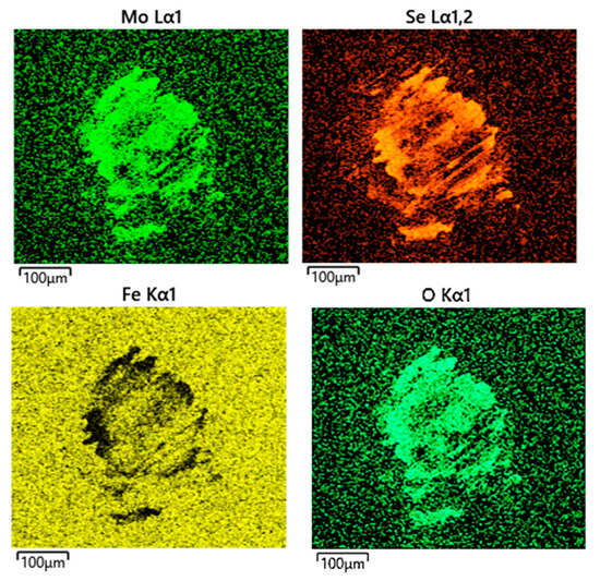 Figure 11 shows the surface morphology of the ball wear scar. The wear scar was circular in shape, exhibited a smooth appearance, and had a large diameter of 385 µm. Some wear particles were visible around the edges of the wear scar. As shown in Figure 12, EDS mapping revealed that these edges were rich in molybdenum and selenium, indicating the transfer and adherence of some MoSe2 material to the ball during sliding. This transfer layer was not uniformly distributed on the wear scar but rather adhered to its edges. This uneven distribution could be attributed to the presence of PAO4, which acted as a barrier between the sliding surfaces, preventing the uniform bonding of wear particles to the ball.