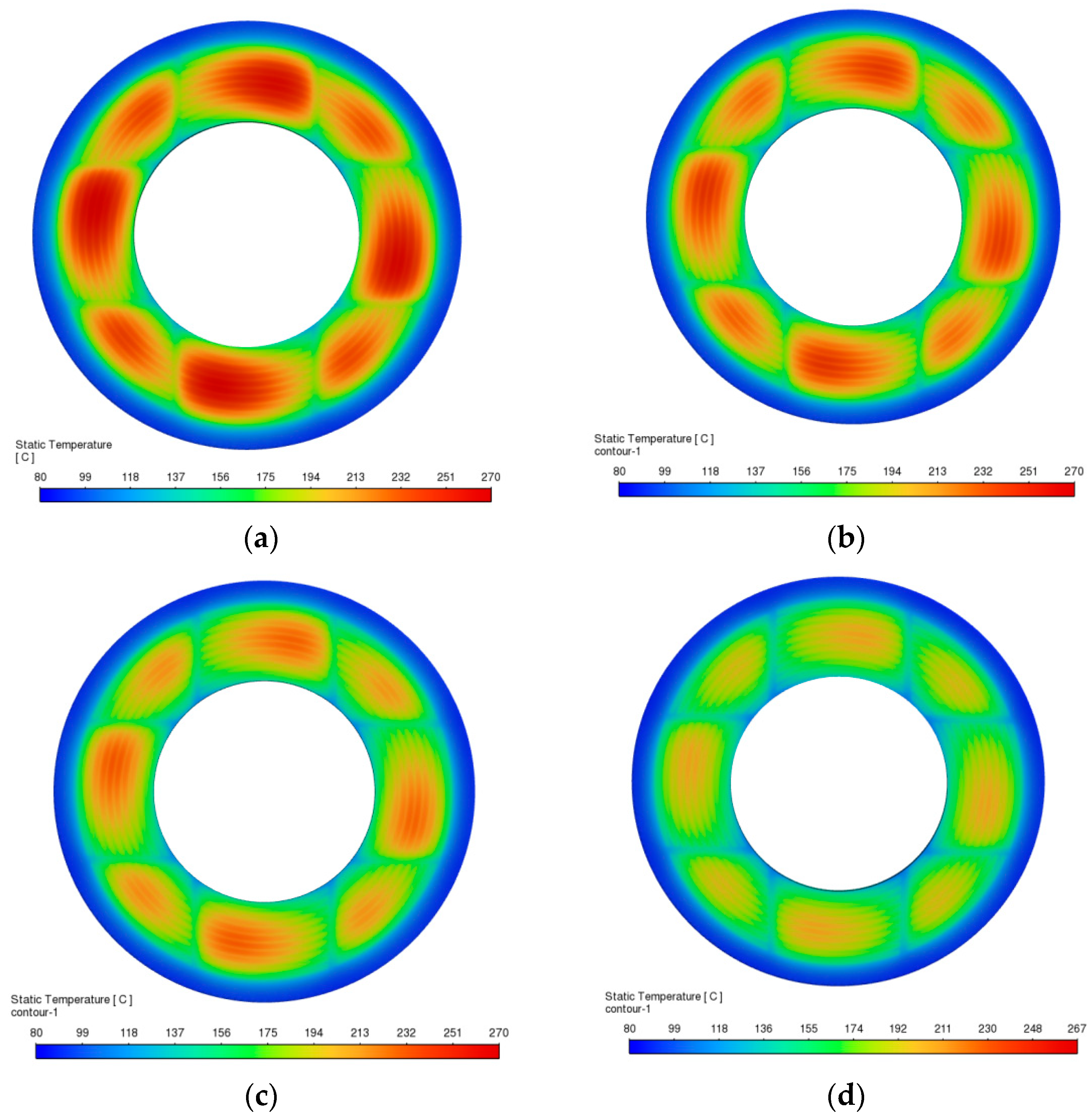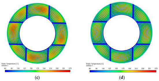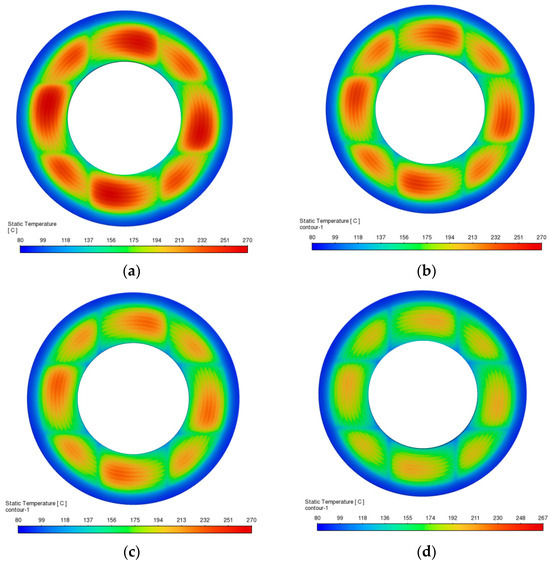 - A lower inlet oil temperature is an effective means of controlling thermal rise. Reducing the inlet oil temperature can markedly enhance heat dissipation. In particular, when the inlet temperature is below 40 °C, its suppression effect on the overall temperature field becomes more pronounced. This provides a clear direction for developing early-stage cooling strategies in the system.