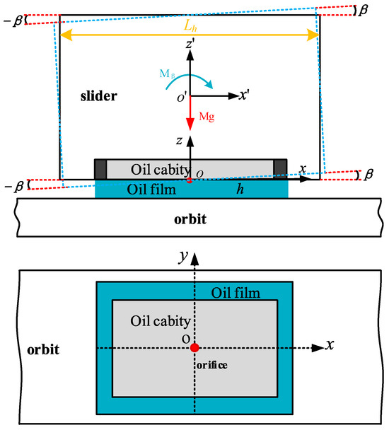 Assuming a rectangular hydrostatic oil pad as shown in Figure 1, the lubricant flows into the small orifice throttle with a constant pressure, then fills the oil chamber. At last, it flows out of the pad through the sealing surface. During the flow of the lubricant, a pressure field is established inside the oil pad, which acts as a load-bearing device. Set the initial oil film thickness between the slider and the wall of the guide strip as h0. The coordinate system xoz is established at the rectangular oil pad and the motion coordinate system x’o’z’ is established at the center of mass of the slider. When the slider is subjected to a pitch deflection load Mβ, it will deflect β around its center of mass o’ and the oil film is thus tilted. The thickness of the oil film is related to the coordinate x of the rectangular oil pad, which we denote as h(x). Considering the normal use of the oil pad, the slider and the guide bar will not be in collision. In other words, the β angle is not greater than 2h/Lh (Lh is the length of the slider). The β is generally less than 10−4 rad, which is a very small amount.