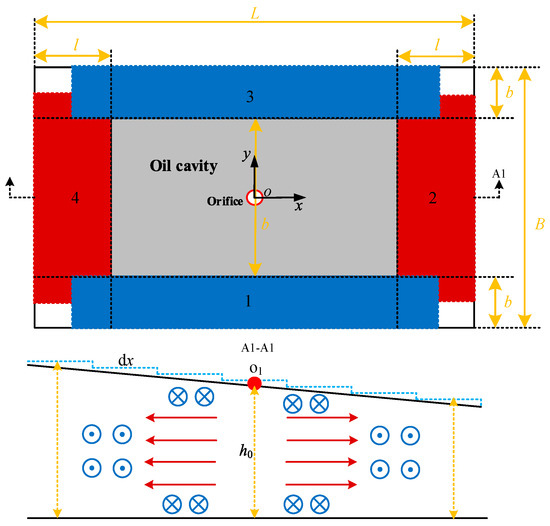 When the slider deflects, the oil film gap is no longer uniform, and the flow of lubricant in the oil film gap no longer follows the parallel plate formula [28]. Then the flow relationship needs to be deduced based on lubrication principles. As shown in Figure 2, the sealing surface is divided into four flat flow areas with lengths and widths L and B, respectively, and the sealing edges have lengths and widths l and b, respectively. The oil in basins 1 and 3 flows parallel to the y-axis, i.e., the blue arrows in the view A1-A1, and the oil in basins 2 and 4 flows along the x-axis direction, i.e., the red arrows in view A1-A1.