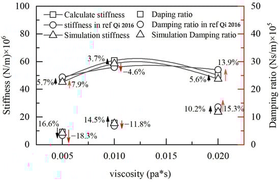 Figure 3 shows the comparative results of the normal load carrying characteristics of a single rectangular oil pad. Within the same oil pad structure, oil supply pressure and dynamic viscosity, it can be seen that the calculated stiffness, the stiffness results in the literature3 and the simulated stiffness results are basically the same, but there are some differences in the damping results. Taking the CFD simulation results as a reference for comparison, the calculated damping (black solid arrow in the figure) is approximately 8% less than the simulated damping when the dynamic viscosity of the fluid is low, and the damping results in the literature (red curved arrow in the figure) is approximately 18.3% less than the simulated damping. As the dynamic viscosity of the fluid increases, the calculated damping deviates from the damping in the literature to within 20% of the simulated damping. The main reason for the analysis error is that the parallel plate flow calculation method simplifies the flow at the four corners of the rectangular oil pad, resulting in the difference in the calculation of the oil film pressure from the real situation.