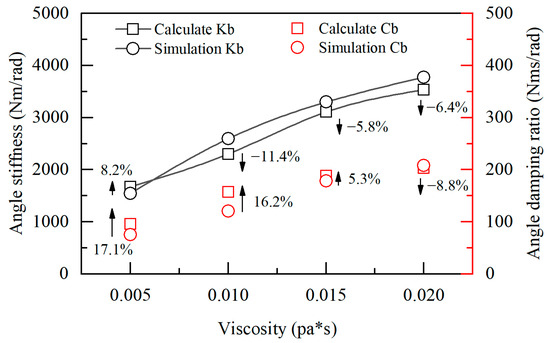 Figure 4 shows the calculation results of a single rectangular oil pad against pitch deflection. It can be seen that, under the same oil pad parameters, the results obtained by the calculation in this paper are closer to the simulation analysis results. Under different oil dynamic viscosities, the trends are basically the same, with a maximum deviation of 11.4% for angular stiffness and 17.1% for angular damping. The differences between the calculated results and the simulated results are mainly caused by two aspects: (1) the complex diffusive flow process at the four corners of the rectangular oil pad is still idealized when deriving the pressure flow relationship equation for the inclined flat plate. (2) the higher order non-linear term of the flow balance equation is omitted when building the calculation model for the deflection load resistance of the oil pad.