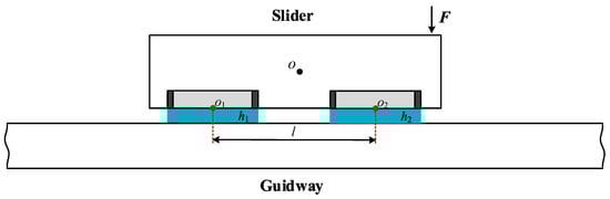 Take an open-hydrostatic slider supported by two adjacent rectangular oil pads (Figure 5) as an example. The distance l between two oil pad centers is 0.1~0.4 m. Assuming that the normal bearing capacity of the two oil pads is the same as the anti-deviation load capability, the oil film gap between oil pad 1 and oil pad 2 changes 5~20 μm when the slider deflects 1 × 10−4 rad under the external eccentric load.