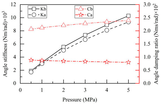 Adjusting the feed pressure of the rectangular oil pad to 0.5~5 MPa, we can obtain the angular stiffness and angular damping of the rectangular oil pad under different supply pressure. As can be seen from Figure 6, increasing the feed pressure of the rectangular oil pad can increase the load-bearing pressure of the pad, which significantly improves the angular stiffness of the pad. During this process, there is a small fluctuation (about 10%) in the angular damping of the oil pad, which indicates that the angular damping of the oil pad is not sensitive to the oil supply pressure. In addition, when the feed pressure is within 1 MPa, the pitch angle stiffness is basically the same as the torsion angle stiffness. As the feed pressure increases, the difference between the two stiffness increases gradually. It indicates that the rectangular oil pad has better anti-pitch eccentric load characteristics under large feed pressure.