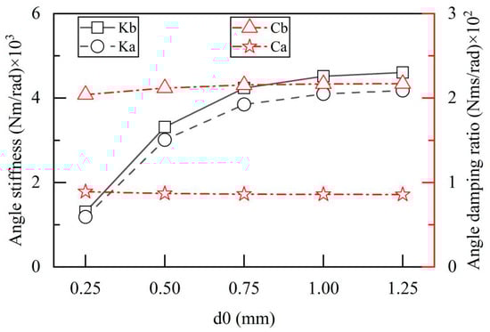 Adjusting the micro-hole to the common engineering value (0.25 mm~1.25 mm), we can obtain the effect law of the diameter of orifice on the angular stiffness and angular damping of rectangular oil pad. As the diameter of the micro-hole increases, the angular stiffness of the rectangular oil pad gradually increases at the beginning, then tends to level off. However, the angular damping has little change during the process. In general, the diameter of orifice should be designed for optimal throttling (The diameter of orifice should be 0.5 mm). From Figure 7, if the diameter of orifice increases from 0.5 mm to 0.75 mm, the pitch angle stiffness and torsion angle stiffness increases from 3.32 × 103 and 3.01 × 103 Nm/rad to 4.24 × 103 Nm/rad and 3.85 × 103 Nm/rad, respectively. With a small impact on the throttling characteristics, the anti-deviation load capability of the rectangular oil pad is improved significantly.