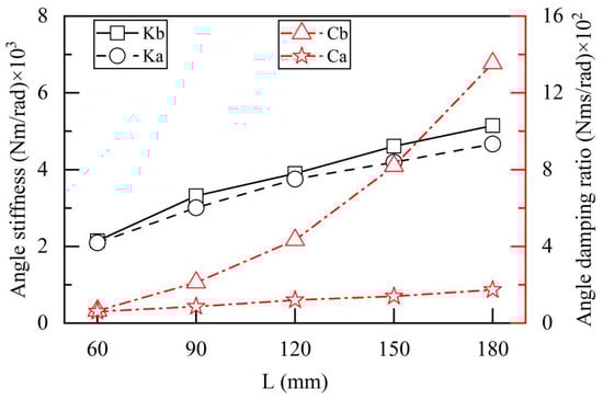 The influence of the length and width of the rectangular oil pad on its angular stiffness and angular damping is shown in Figure 8. Increasing the length of the rectangular oil pad can significantly enhance the angular stiffness and pitch angular damping in both directions. When the length of the oil pad is increased from 60 mm to 180 mm, the pitch angular damping increases from 65.9 Nm·s/rad to 1354.7 Nm·s/rad, indicating that increasing the length of the rectangular oil pad within a certain range is beneficial to improving its dynamic anti-eccentric load capacity. Its physical significance is that the equivalent acting span of the oil pad in this direction is raised, and under the same eccentric load moment, the oil film gap of the oil pad will change less, thus showing better angular static and dynamic characteristics.