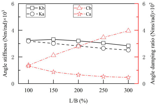 In order to further analyze the comprehensive effect of rectangular oil pad size on its anti-eccentric load capacity, the effects of different aspect ratios on the diagonal stiffness and angular damping under the same pad area were analyzed. As shown in Figure 9, with the increase in the length width ratio of the rectangular oil pad, the angular stiffness and torsional swing angle damping generally show a downward trend. During this process, the pitch angle damping increases continuously. When the aspect ratio increases from 100% to 300%, the pitch angle damping increases by about three times. It can be seen that the increase in the length width ratio of the rectangular oil cushion sacrifices some of the anti-eccentric load capacity and the dynamic eccentric load capacity in the torsional direction. However, the suppression effect of dynamic bias load in pitch direction is significantly improved. For the hydrostatic support system bearing the far end torque, under the condition of determining the bearing area of the oil pad, the dynamic mechanical characteristics can be improved by increasing the length width ratio of the rectangular oil pad, while meeting the static support capacity.
