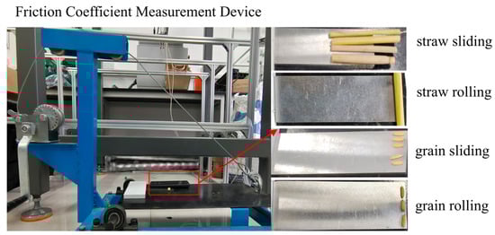 To ensure the accuracy of the DEM simulation, it is essential to experimentally calibrate the key parameters within the model. To obtain the fundamental parameters required for the DEM model, field measurements were conducted on rice samples (cultivated in the Zhenjiang urban district), as shown in Figure 3. Data such as the major/minor axis dimensions and moisture content were recorded (Table 1). An inclined plane test apparatus (Figure 4) was used to determine the coefficients of static and rolling friction between the rice stalks/grains and a Q235 steel plate. The experiment was repeated 10 times for each condition, and the average values were taken. The measured coefficient of static friction between the stalk and the steel plate ranged from 0.25 to 0.40 (with an average of 0.3153), while the coefficient of rolling friction ranged from 0.19 to 0.22 (with an average of 0.21).