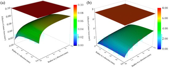 Theoretical calculation results of the influence of bio-inspired bump radius on contact area: (a) for the grain; (b) for the stalk.