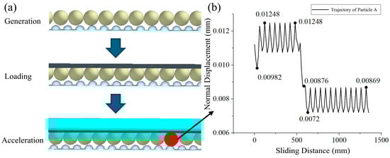 Simulation of the stalk’s motion on the bio-inspired bumped surface. (a) Snapshots illustrating the periodic “contact-disengagement” process. (b) The corresponding normal displacement curve of a particle on the stalk, showing micro-vibrations perpendicular to the sliding direction.