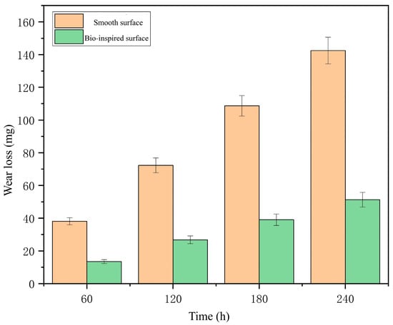 After 240 h of continuous wear testing, the two surfaces exhibited a significant difference in their degree of wear. Figure 12 presents a comparison of the cumulative mass loss for the smooth surface (control group) and the bio-inspired surface (experimental group) over the test period. The control group (smooth surface) experienced an average cumulative mass loss of approximately 142.5 ± 8.2 mg, with its wear rate remaining relatively constant throughout the experiment. In stark contrast, the experimental group (bio-inspired surface) showed an average cumulative mass loss of approximately 51.3 mg.