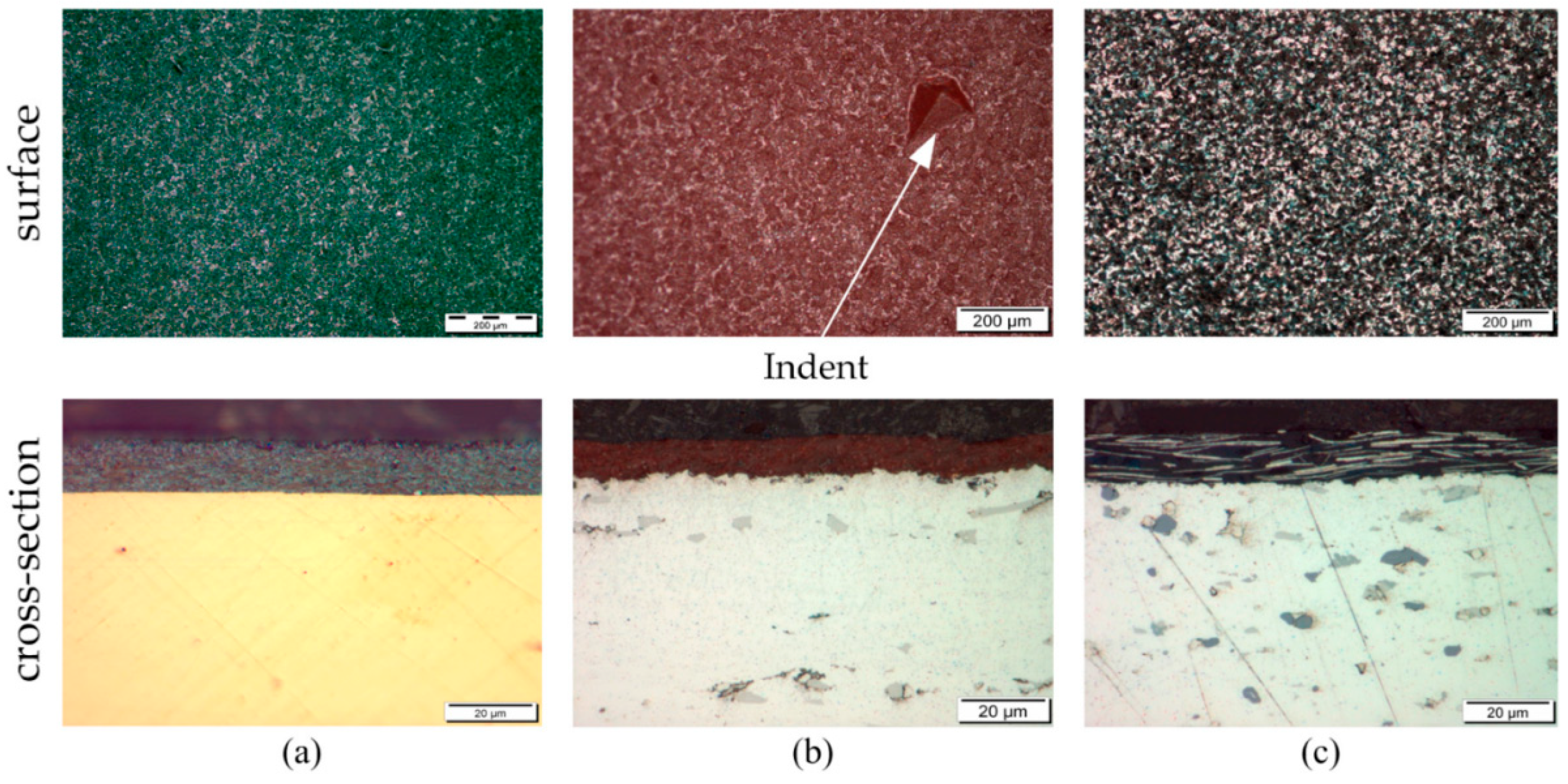 Light microscopic analysis of the bearing shell showing surface (up) and cross-section (down): (a) PB_1, (b) PB_2 and (c) PB_3. Reprinted with permission from Ref. []. 2020, MDPI.